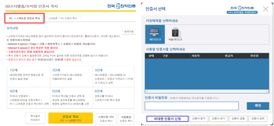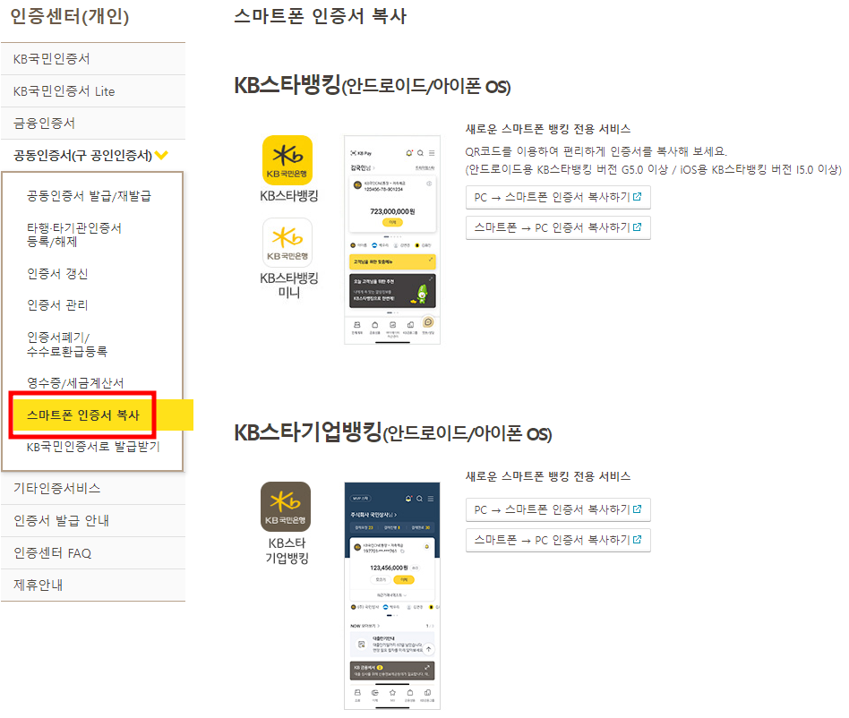 4단계 PC에서 인증센터 > 스타뱅킹/모바일 인증서복사 > PC->스마트폰 인증서 복사하기 선택
