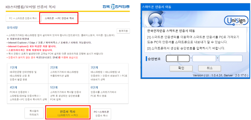 5단계스마트기기에서 복사할 인증서 선택 후 생성되는 승인번호를 PC에 입력