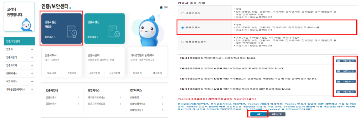 1. 인증/보안센터에 들어 오셨다면, 인증서 발급, 재발급 바로가기를 선택합니다.