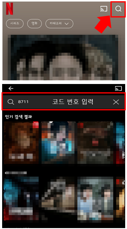 1. 모바일 넷플릭스에 접속 한다음 우측 상단 돋보기 모양을 선택한다.