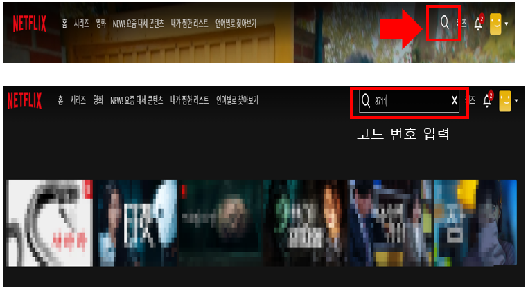 1. PC에서 넷플릭스 로그인 진행 후 우측 상단 돋보기 모양을 선택한다.