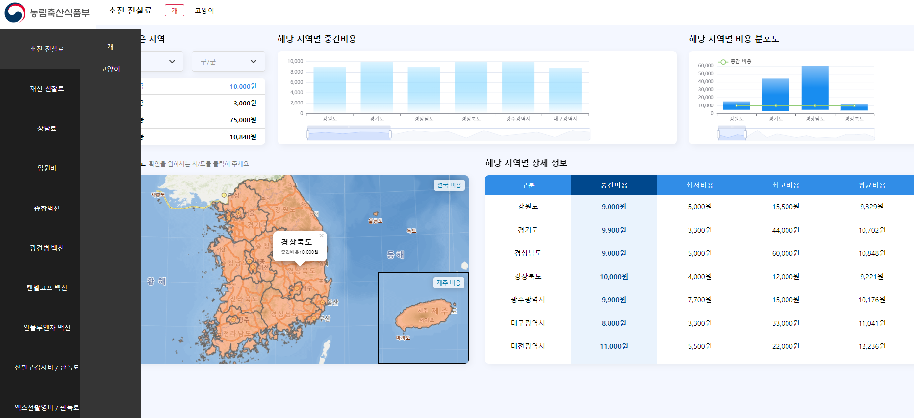 지역별 진료비를 확인 하기 위해서는 농림축산식품부 홈페이지를 통해 확인 하실 수 있습니다.
