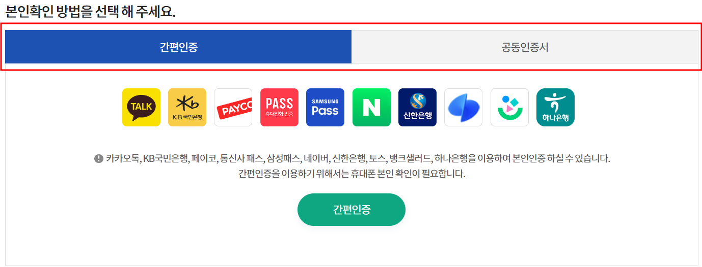 2. 간편인증 및 공동인증서를 선택하여 본인 인증을 진행 합니다.