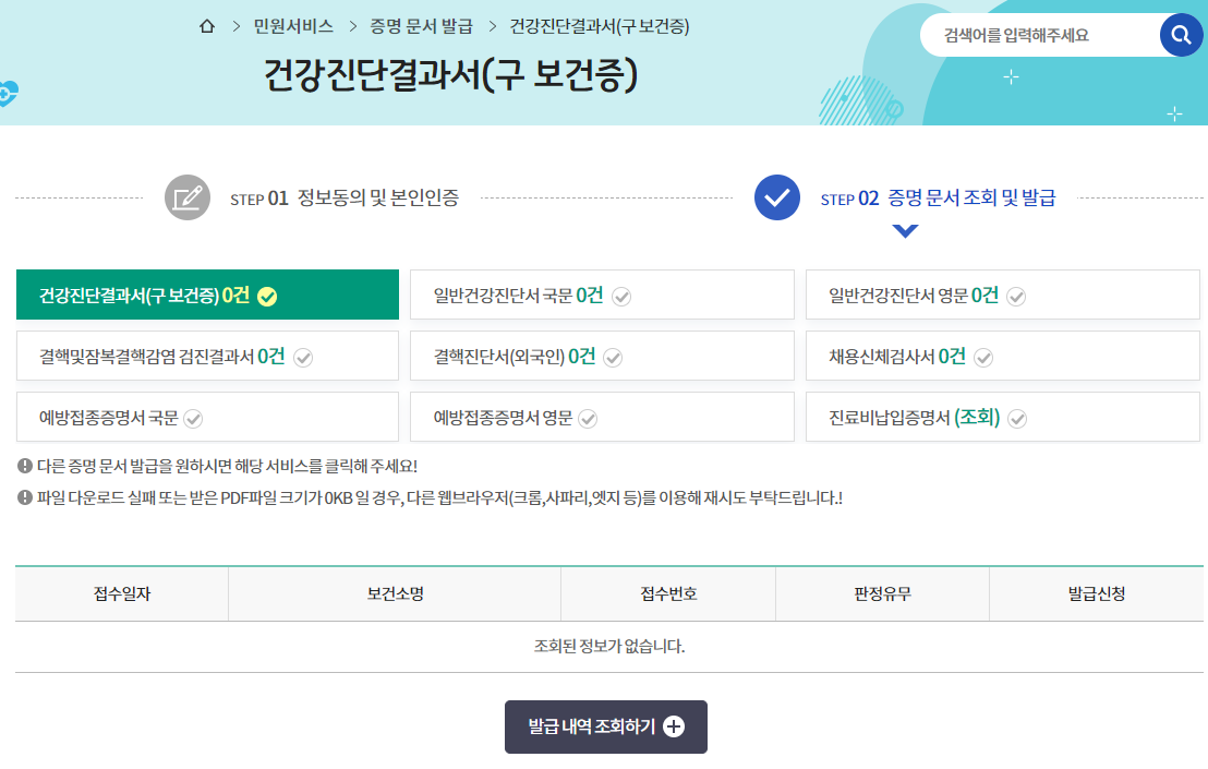 3. 발급 내역을 조회 하시면 보건증 확인이 가능합니다.