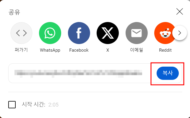 1. 동일한 방법으로 내가 원하는 동영상에서 공유를 누르신 후 링크를 복사 진행 합니다.