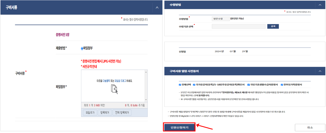 위 내용이 완료 되었다면 민원신청하기를 진행하여 진행해 주시기 바랍니다.