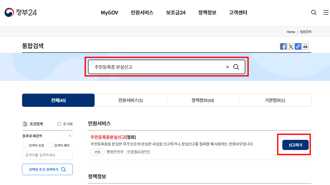 정부 24 홈페이지에 접속하여 주민등록증 분실 신고를 진행 해 주시면 되는데요.