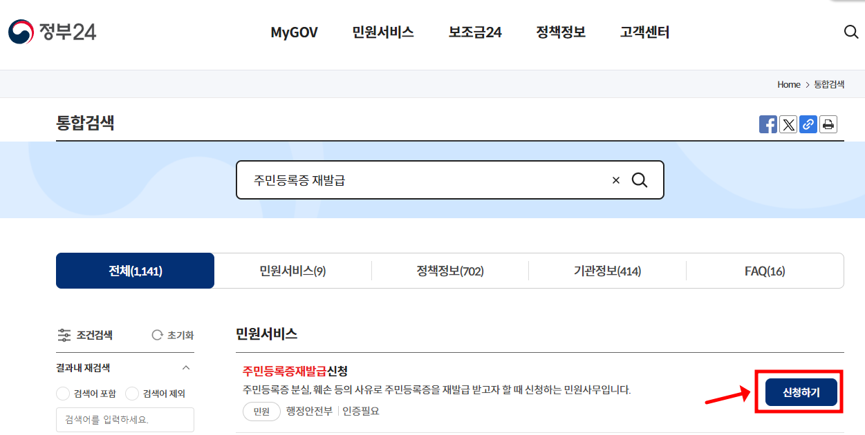 정부 24 홈페이지에 접속하여 "주민등록증 재 발급" 을 검색하여 신청하기를 진행합니다.