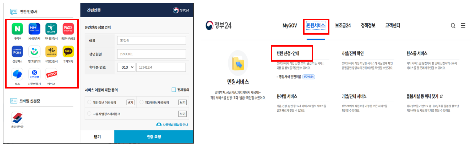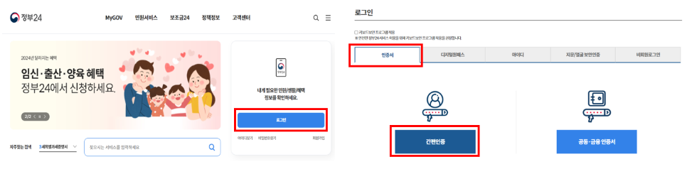 간편한 신청 절차: 정부24 홈페이지에서 간편 인증 또는 공동인증서 (구 공인인증서)로 본인확인후 신청이 가능합니다.