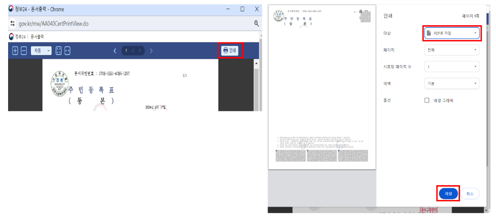 주민등록 등본 온라인신청 4. PDF 저장방법