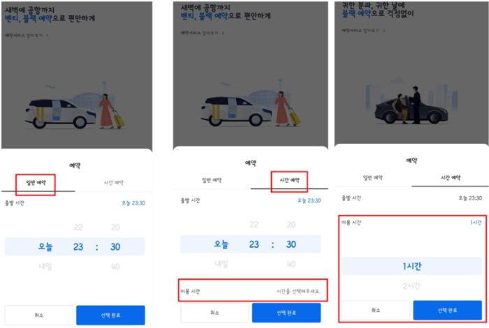 4. 택시 예약은 일반 예약과 시간 예약이 있습니다.
