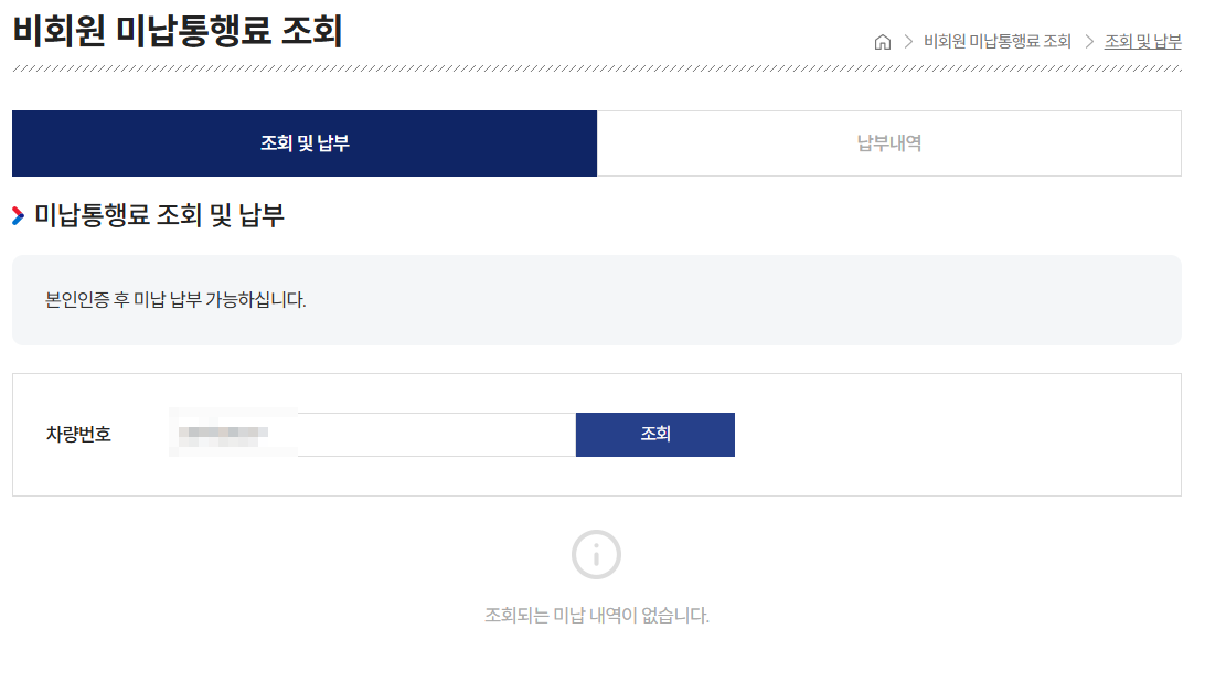 하이패스 단말기가 없거나 작동하지 않더라도, 해당 차량의 진출입 기록이 시스템에 남아있기 때문에 차량번호로 하이패스 통합 사이트에서 미납요금 조회가 가능합니다.