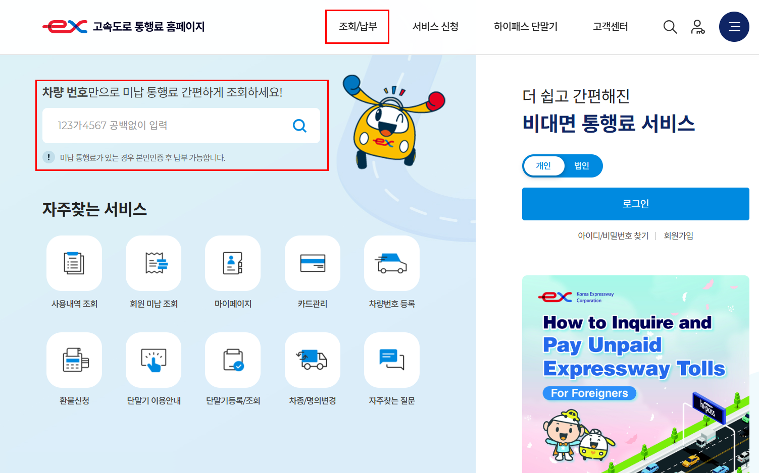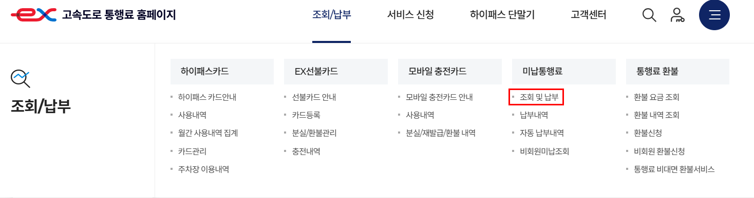 고속도로 통행료 홈페이지에 방문하여 조회 및 납부 항목을 선택합니다.