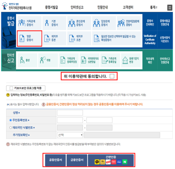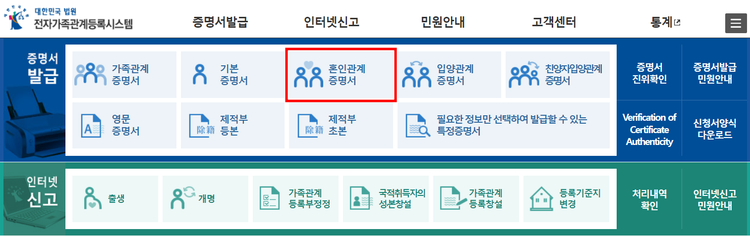 -. 홈페이지 중앙 부분 혼인관계 증명서를 선택합니다.
