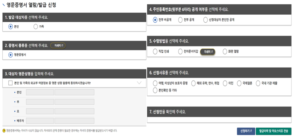 영문 증명서 열람/발급 신청서에 대한 내용을 작성 후 신청하기를 선택해 주시면 됩니다.