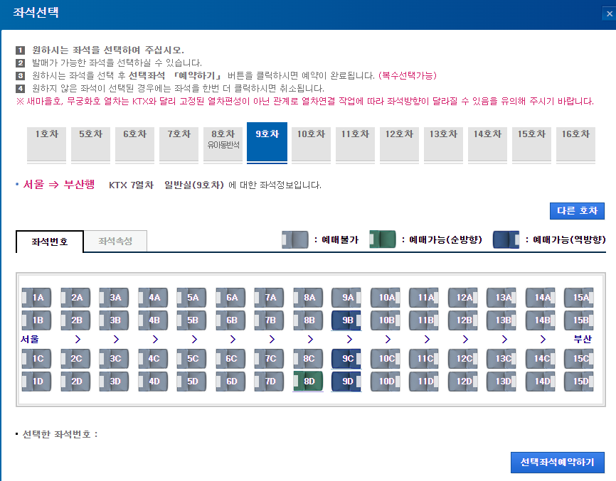원하시는 호차 선택 및 좌석을 선택 후 예약 하기를 진행해 주시면 됩니다.