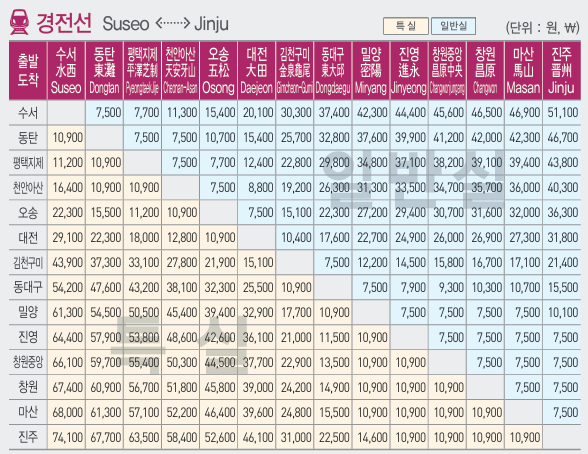SRT 운행 노선을 참고하시기 바라며, 경전선 및 경부선 뿐만 아니라 그외 운임표가 궁금하시다면 아래 링크를 참고해 보시기 바랍니다.