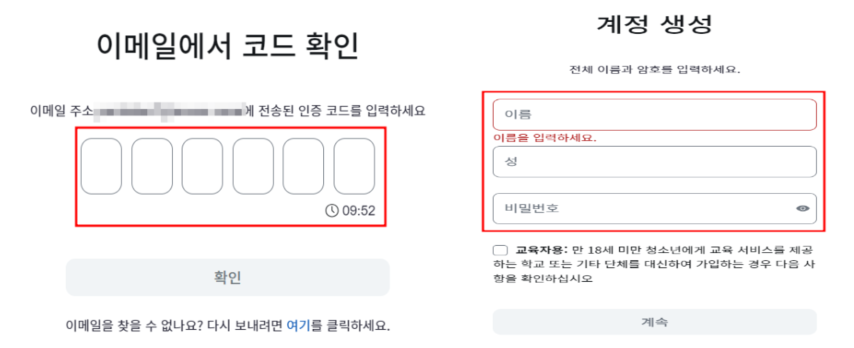 5. 이름과 성, 비밀번호를 입력 후 회원 가입을 진행해 주시면 됩니다.