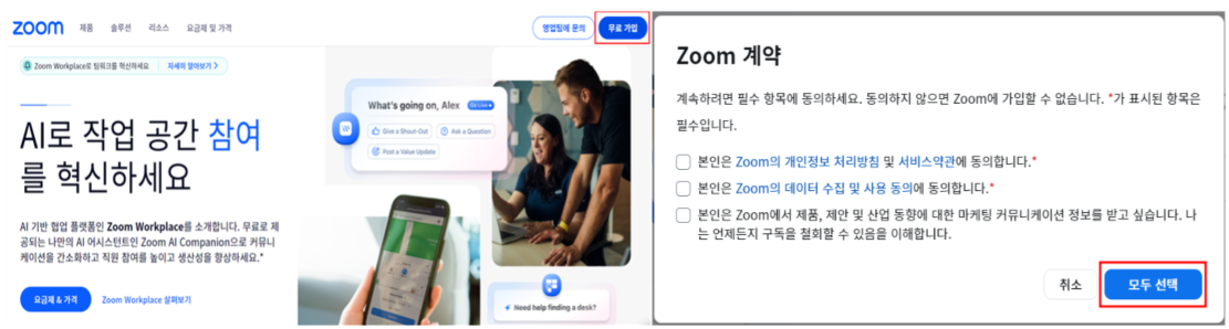 2. zoom 계약 안내는 모두 선택 후 다음으로 이동합니다.