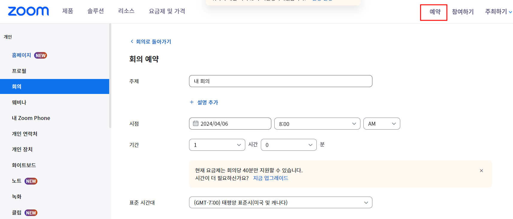 -. 개인 -> 회의 -> 회의예약을 통해 주제 및 날짜 및 시간을 입력 후 진행하시면 됩니다.